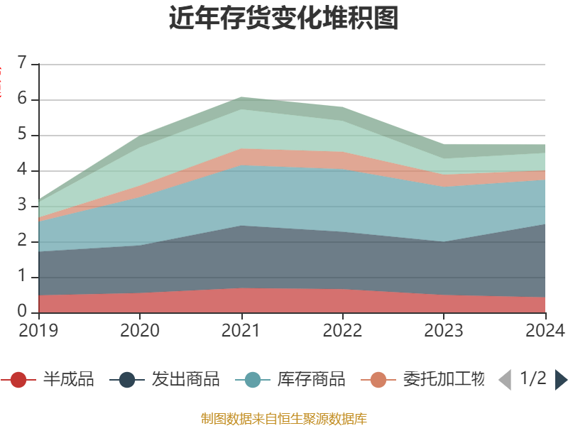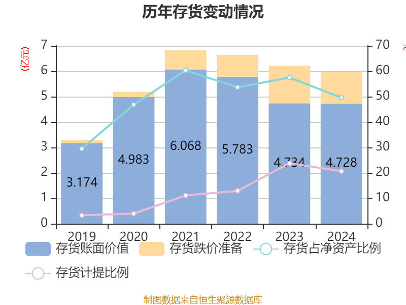 从存货变动来看,截至2024年末,公司存货账面价值为4.73亿元,占净资产的49.56%,较上年末减少56.98万元。其中,存货跌价准备为1.23亿元,计提比例为20.65%。