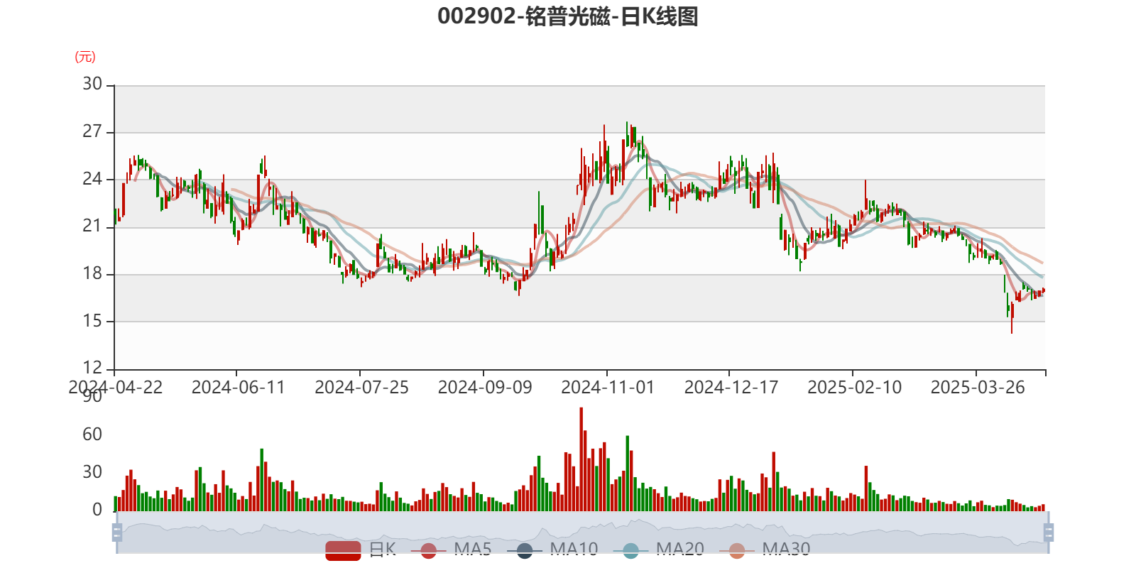 以4月21日收盘价计算,铭普光磁目前市盈率(TTM)约为-13.83倍,市净率(LF)约4.21倍,市销率(TTM)约2.46倍。